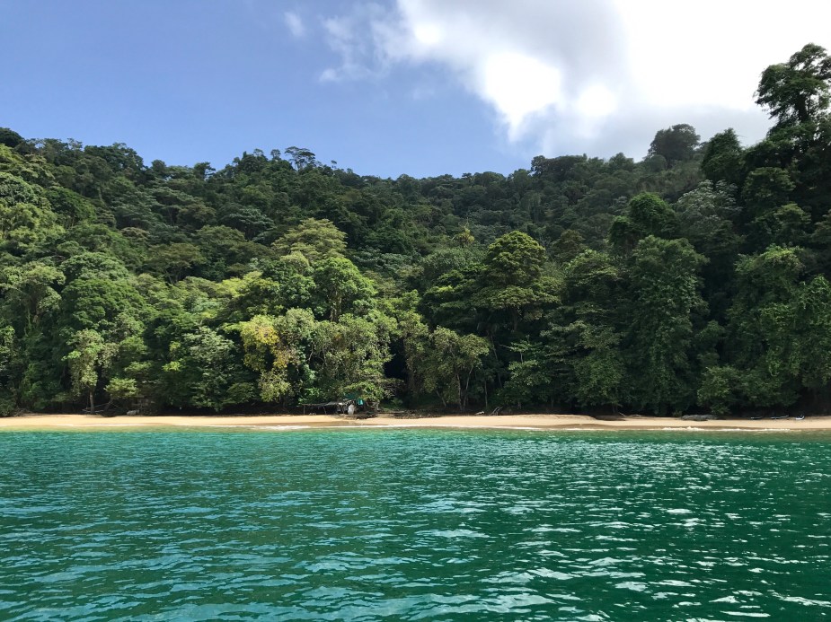 På stranden fant vi en naturlig ferskvannsdusj – det vil si fjellvann som rant ned gjennom regnskogen og kom ut gjennom et rør ved stranden. Dit dro vi hver dag for å dusje, ettersom vi ikke hadde noe særlig med vann igjen på båten etter Atlanterhavskryssingen.