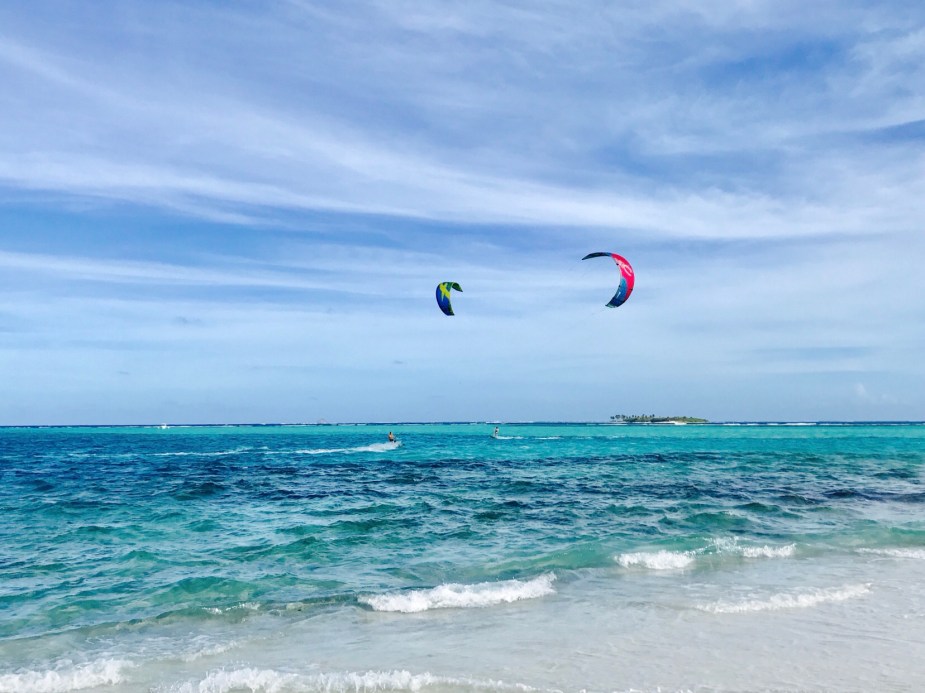 Christian og Magnus kiter utenfor Jamesby, Tobago Cays.