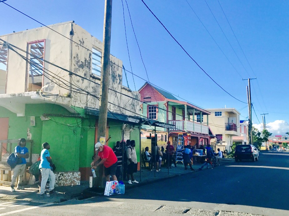 Hovedgaten i Portsmouth, Dominica. Skader på bygninger og el-nett etter orkanen Maria var tydelig å se.