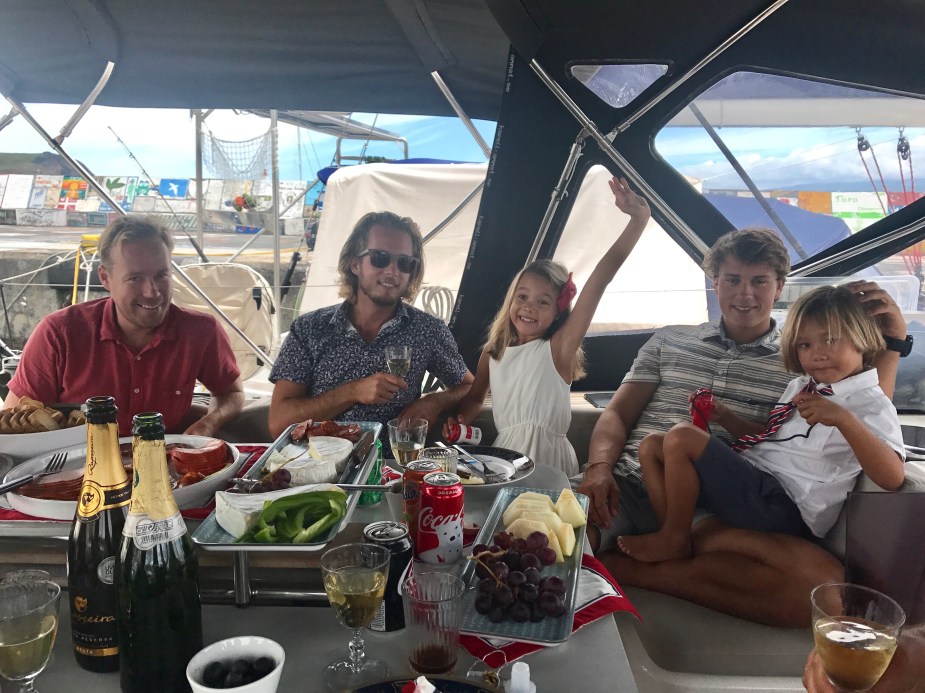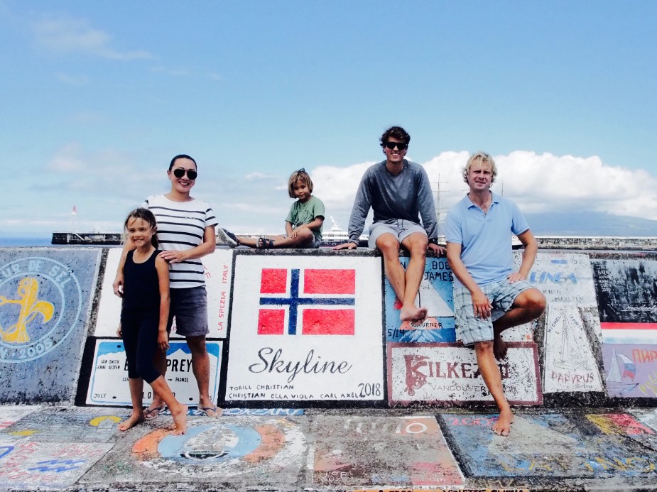 På bryggen i Horta Marina traff vi igjen våre venner på den norske seilbåten Windy Lady. Vi leide scootere og kjørte opp til fjellene. Vi ble kjent med Take Off, en svensk barnefamiliebåt. Og før vi seilte videre, fikk vi malt et «Skyline» veggmaleri på bryggen. Det er en tradisjon for alle langturbåter som har vært innom øya.